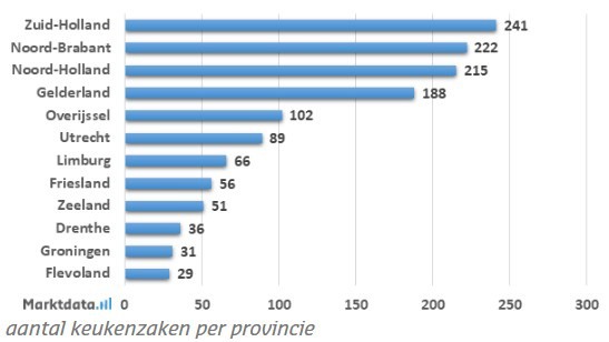 De provincie Zuid-Holland telt met 241 keukenzaken het grootste aantal vestigingen. 18,2 Procent van alle keukenzaken is in deze provincie gevestigd. De provincie Flevoland heeft met 29 keukenzaken het kleinste aantal vestigingen. Onderstaand figuur toont de ranglijst van het aantal vestigingen van keukenzaken per provincie.