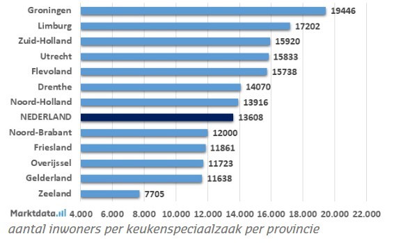 Zeeland is het minst blauw gekleurd. Dit komt door het grote aantal keukenzaken in verhouding tot het inwoneraantal van Zeeland. De provincie Groningen telt met ruim 19.400 inwoners per vestiging het grootste aantal inwoners per keukenspeciaalzaak. In Zeeland is het aantal inwoners per keukenspeciaalzaak (7.705) het kleinst. Het landelijk gemiddelde komt uit op 13.608 inwoners per keukenspeciaalzaak. Onderstaand figuur toont de ranglijst van het aantal inwoners per keukenspeciaalzaak per provincie.