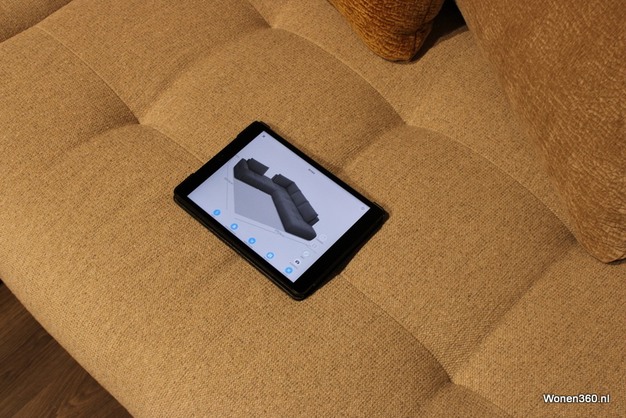 De Arnes-bank is een echte elementenbank. De bank is in losse delen beschikbaar, zodat je deze gemakkelijk kunt herinrichten. Het model is volledig rondom gestoffeerd en met een krokodilaansluiting vastgemaakt. Met behulp van eigen software, die Stella Furniture ter beschikking stelt, kan de retailer de bank via een 3D-beeld aan de consument laten zien. Er is zelfs een mogelijkheid om een foto van de bestaande ruimte te maken, zodat de consument zijn of haar eigen woonkamer kan uploaden. Dit doet het bedrijf inmiddels vijf jaar en het werkt uitstekend om de consument sneller een beslissing te laten nemen, aldus Wiebe.