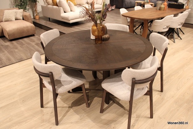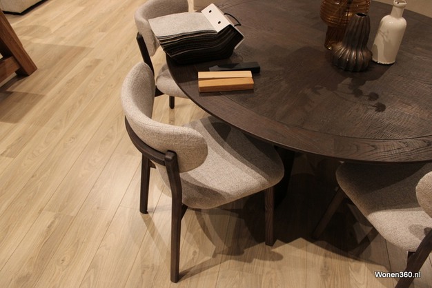 De ronde tafel met bijpassende stoelen is in Japandi-stijl gepresenteerd. Volgens Wiebe is dit de best verkochte tafel van de beurs. De tafel is erg goed ontvangen, zeker in combinatie met de eetkamerstoelen. Net als bij de lange tafel is ook hier gebruikgemaakt van visgraat wat de ambachtelijke kwaliteiten van de producent laat zien, aldus Wiebe. De tafels zijn overigens ook zonder visgraat verkrijgbaar. De bijpassende stoelen zijn leverbaar in nagenoeg dezelfde kleuren als de eiken tafels en onderstellen, en tevens in vele stoffen te bestellen.