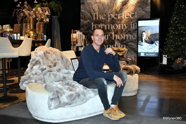 Edo Riedeman van Winterhome, bekend om zijn hoogwaardige Vegan Fur, op Meubelbeurs Brussel in 2024. Zijn kleden zijn gemaakt van topkwaliteit acryl, modacryl of een combinatie van beide, waarbij weelderige zachtheid en ongeëvenaarde luxe centraal staan.