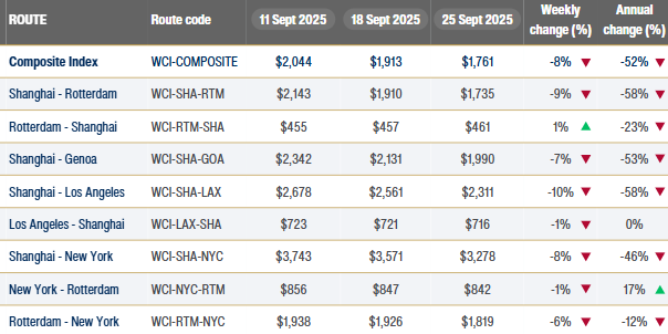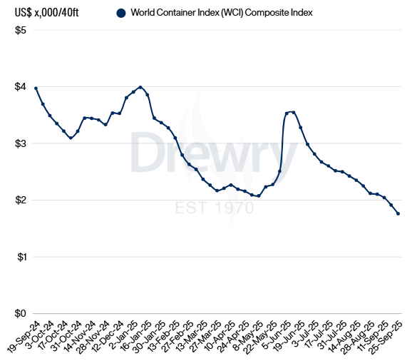 De World Container Index (WCI) van Drewry, een wekelijkse index die de gemiddelde spotprijzen weergeeft voor het vervoer van een 40-voets container op belangrijke mondiale zeevaartroutes, is in de week van 26 september met 8% naar $1.761. Een van de grootste dalingen van de afgelopen periode.