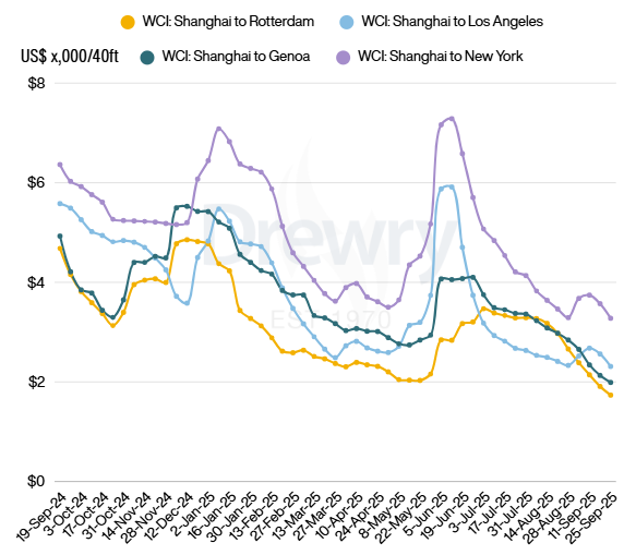 De spottarieven van Shanghai naar Los Angeles daalden met 10% tot $2.311 per 40ft, terwijl de tarieven naar New York met 8% terugliepen tot $3.278 per 40ft. Hoewel er begin september een korte opleving was, is het effect van GRI's (General Rate Increases) en blank sailings inmiddels afgenomen, wat tot lagere tarieven heeft geleid.