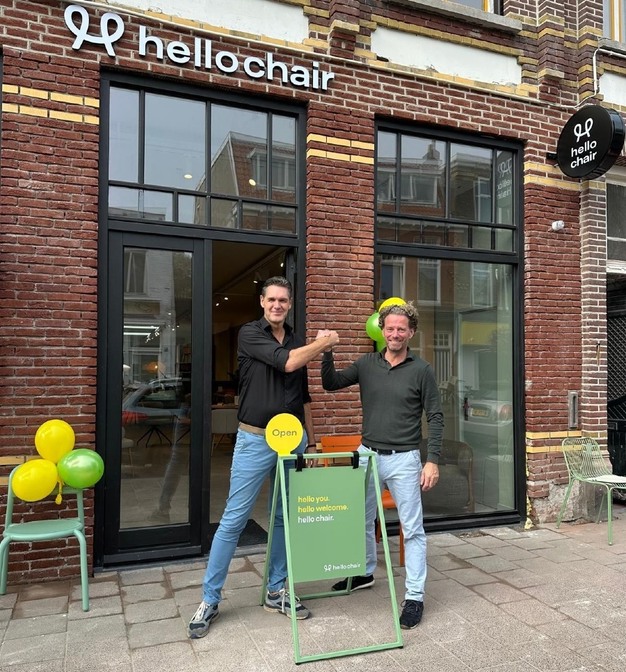 © HelloChairStoelenspecialist HelloChair blijft groeien. Het bedrijf van ondernemers Jan-Noud Hutten en Joost Wels heeft zijn vierde winkel geopend, ditmaal aan de Ginnekenweg 50 in Breda. De nieuwe showroom telt ruim 350 vierkante meter en biedt keuze uit meer dan 300 eetkamerstoelen, aangevuld met eettafels, vloerkleden en verlichting.