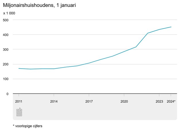 Op 1 januari 2024 had 5,5 procent van de huishoudens een vermogen van 1 miljoen euro of meer. Dat zijn 452 duizend huishoudens, 17 duizend meer dan een jaar eerder. Vooral in Bloemendaal en Laren wonen relatief veel miljonairs: 1 op de 3 huishoudens is er miljonair. Dit meldt het Centraal Bureau voor de Statistiek (CBS) op basis van nieuwe vermogenscijfers. De waarde van de eigen woning en eventuele hypotheekschuld zijn daarin meegerekend.