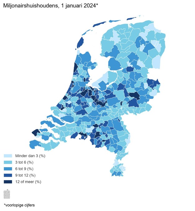 In Noord-Holland en Utrecht wonen in verhouding de meeste miljonairs (7 procent van de huishoudens). De twee gemeenten met het hoogste aandeel miljonairs liggen in Noord-Holland: Bloemendaal en Laren. Daar is ongeveer 1 op de 3 huishoudens miljonair. Andere gemeenten met veel miljonairs zijn Blaricum (25 procent), Heemstede (24 procent) en Wassenaar (23 procent).