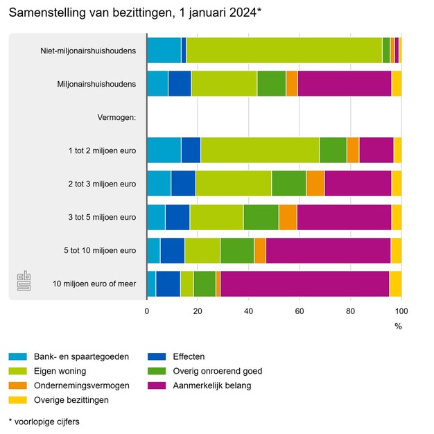 Van de bezittingen van miljonairs bestaat 40 procent uit aanmerkelijk belang (dat wil zeggen dat zij ten minste 5 procent van de aandelen van een bedrijf bezitten) en ondernemingsvermogen. Een kwart bestaat uit de waarde van de eigen woning. Bij niet-miljonairs vormt de eigen woning ruim drie kwart van de bezittingen, en aanmerkelijk belang en ondernemingsvermogen 3 procent. Bij een groter vermogen van miljonairshuishoudens is het aanmerkelijk belang en ondernemingsvermogen in verhouding ook steeds groter. Het aandeel eigen woning in het totale bezit neemt dan juist af.