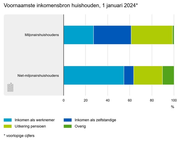 Bijna 40 procent van de miljonairshuishoudens heeft pensioen als voornaamste inkomensbron. De rest heeft werk als voornaamste inkomensbron. Daarvan is 55 procent actief als zelfstandige. Dit aandeel neemt al sinds 2014 af. Toen was nog 71 procent van de werkende miljonairs zelfstandige. Van de niet-miljonairs met werk als voornaamste inkomensbron is 14 procent zelfstandige.