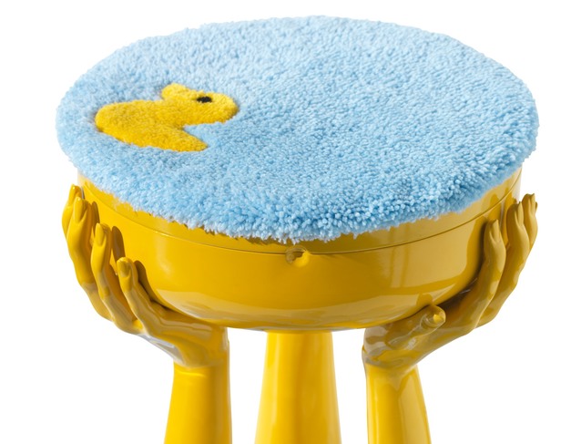 Bart Vinken poseert bij de kruk met badeendje, een eerbetoon aan de jonge ontwerpster Isa die vorig jaar overleed aan leverkanker. Ze stond bekend om haar humor en speelsheid: ze had 150 badeendjes door het hele huis verstopt die nog steeds worden gevonden.