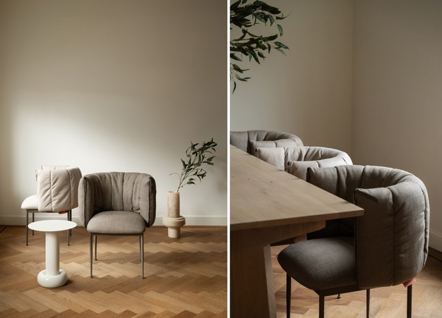 Na het succes van de originele bank in 2024 is de collectie nu uitgebreid met een eetbank, eetstoel en barstoel, waarmee de lijn nog completer wordt. "De Puffer omarmt je letterlijk, en dat spreekt mensen aan", zegt Maarten.