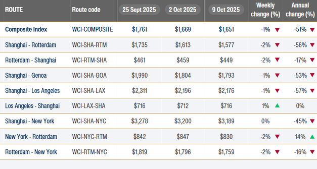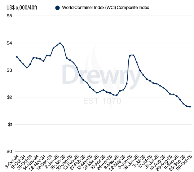 De World Container Index (WCI) van Drewry, een wekelijkse index die de gemiddelde spotprijzen weergeeft voor het vervoer van een 40-voets container op belangrijke mondiale zeevaartroutes, is in de week van 10 oktober met 1% gedaald naar $1,651. Na 17 weken op rij van dalende tarieven is de vraag nu wanneer de containertarieven hun dieptepunt bereiken.