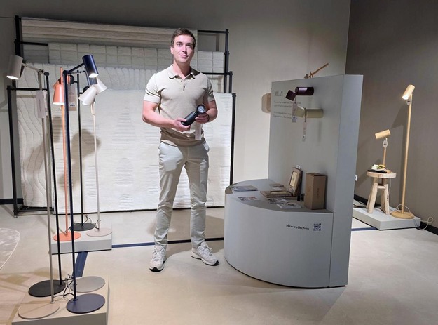 Remco Prins poseert bij de nieuwe Milan-serie (rechts), oplaadbare wandlampen die via een magneet heel makkelijk zijn aan en los te koppelen.