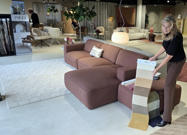Sagitta Tobé poseert bij de bank Chelsea, met in haar handen stalen van het kleurpallet van de nieuwe vloerkledencollectie Pallio. "We proberen onze klanten in onze twee verdiepingen tellende showroom een zo compleet mogelijk programma aan te bieden. We willen retailers ontzorgen."