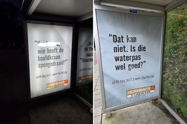 Bouwmarktketen Hornbach heeft reclameposters met de slogan 'Verdomme, wie heeft de hoofdkraan dichtgedraaid?' uit alle bushokjes laten verwijderen. De uiting, onderdeel van de campagne 'Geen project zonder tegenslag', leidde tot tientallen klachten uit het hele land.