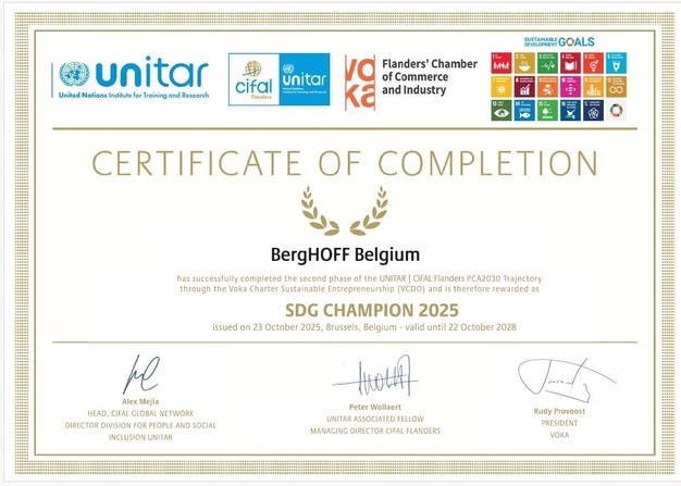 BergHOFF Belgium is officieel erkend als SDG Champion 2025. Het bedrijf ontving het Unitar | Cifal Flanders-certificaat, uitgereikt in samenwerking met Voka – Kamer van Koophandel Limburg. De onderscheiding vormt een erkenning voor de duurzame koers die de onderneming sinds 2019 consequent volgt.
