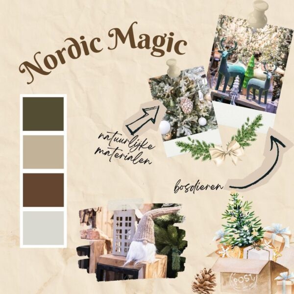 De Scandinavische stijl blijft populair, maar krijgt dit jaar een magische twist. Kleine gnomes en bosbewoners brengen karakter en een dromerige sfeer in huis. Materialen als hout, mos, dennen en wol worden gecombineerd met subtiele glansaccenten, terwijl ornamenten van bosdieren en elfenlampjes een mystiek tintje geven. Deze Nordic Magic creëert een rustgevende, natuurlijke uitstraling die warmte en gezelligheid uitstraalt.