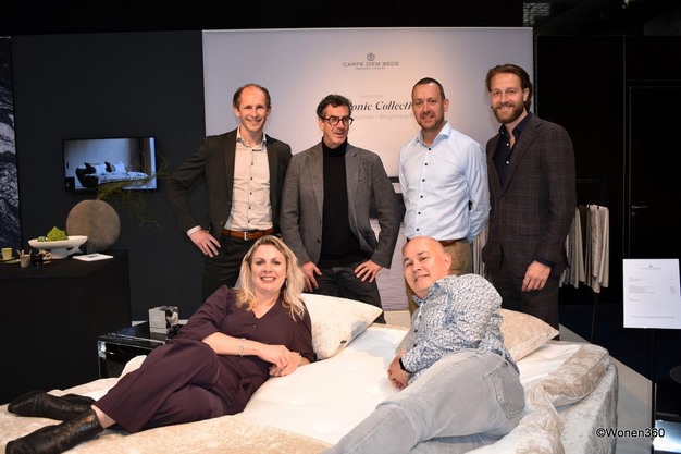Het team van Hilding Anders op Meubelbeurs Brussel 2024, met staand v.l.n.r. Dennis Pronk, Frank Abbeel, Jurgen Rotthier en Lars de Ruiter. Op de voorgrond liggen Yvet Schutte en Daan van Rosmalen.