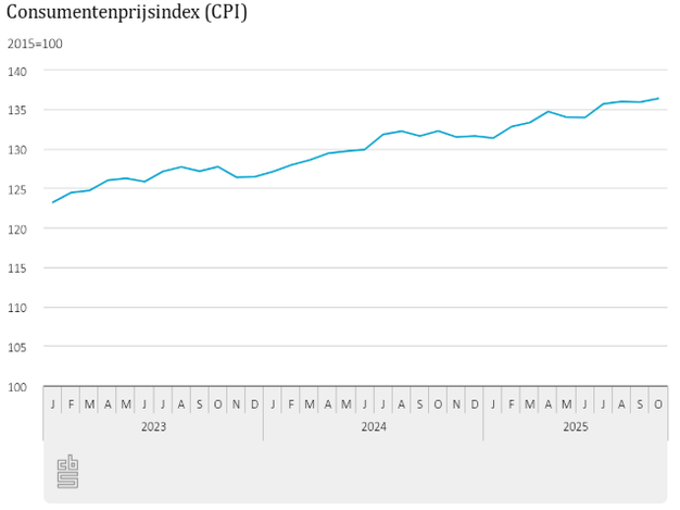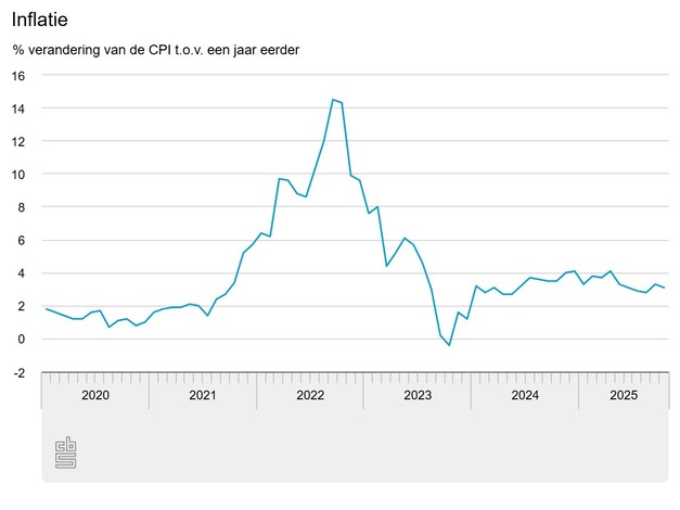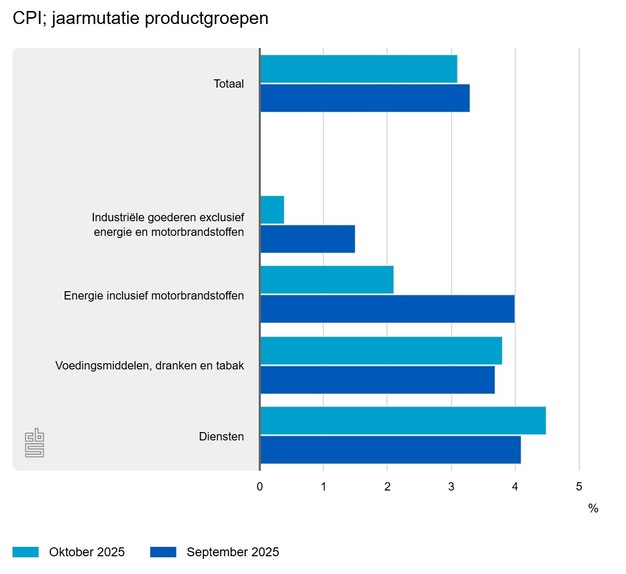 De inflatie in oktober 2025 was 3,1 procent bij de snelle raming, meldt het Centraal Bureau voor de Statistiek (CBS). Deze raming is berekend op basis van nog onvolledige brongegevens. In september was de inflatie 3,3 procent.