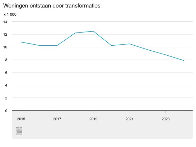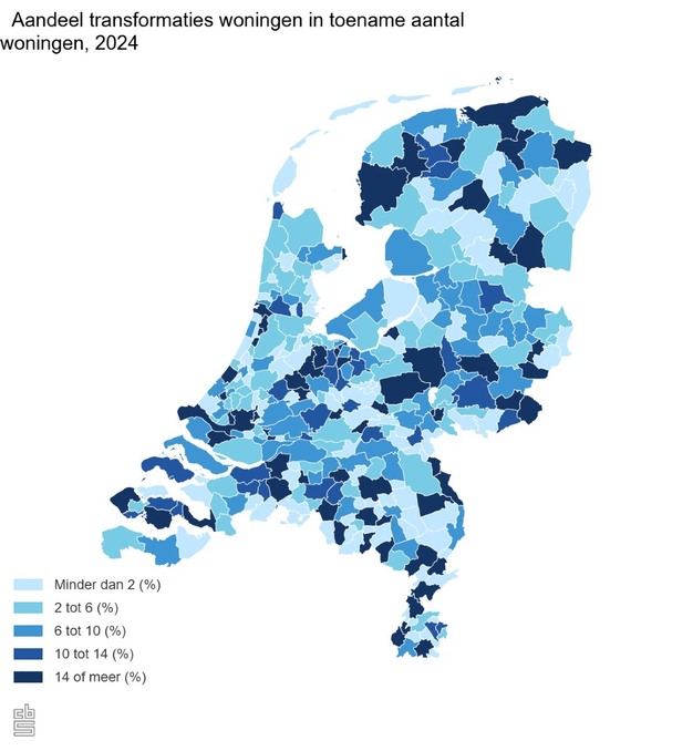 Van alle woningen die er jaarlijks bij komen, is 9 procent ontstaan door ombouwen, ofwel transformatie van bestaande panden. Nieuwbouw blijft de belangrijkste factor voor groei van de woningvoorraad, in 2024 waren dat 69 duizend woningen. Uit een eerste schatting blijkt dat er in het eerste halfjaar van 2025 2,9 duizend woningen uit transformaties bij zijn gekomen.