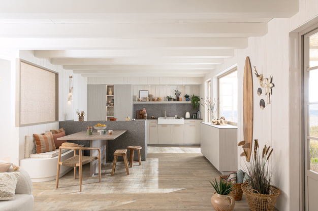 De Duinen-sfeer brengt licht en vrijheid naar het interieur, met een open verbinding tussen binnen en buiten. Gegroefde PET-fronten doen denken aan door de wind gevormd zand, en het Shell-laminaat werkblad roept verweerde steen en schelpen op. Het eiland loopt naadloos over in de eettafel, terwijl lichte kleuren zoals leisteenblauw en Venetiaans notenhout een zachte, natuurlijke sfeer creëren.