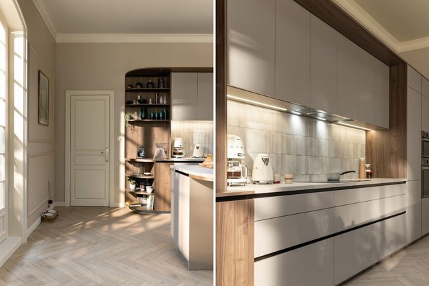 In Rechteroever vormt het interieur een stedelijke cocon. Geïnspireerd door Haussmann-appartementen combineert het klassieke elementen zoals plafondlijsten met een moderne afwerking. Het centrale eiland, afgewerkt in licht terrazzo-laminaat, fungeert als multifunctionele plek om te koken, ontbijten of werken. Warme kleuren in praline en notenhout zorgen voor een uitnodigende, verfijnde uitstraling die past bij het stedelijke ritme.