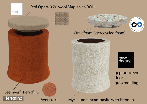 De natuurlijke textuur van het mycelium blijft zichtbaar en wordt afgewerkt met leemverf van Tierrafino, waardoor elke Elifoot zijn eigen karakter krijgt. De zitting is gemaakt van gerecycled schuim van Circlefoam en bekleed met ROHI Maple Wool Fabric Opera, een hoogwaardige en duurzame stof van 96% wol.