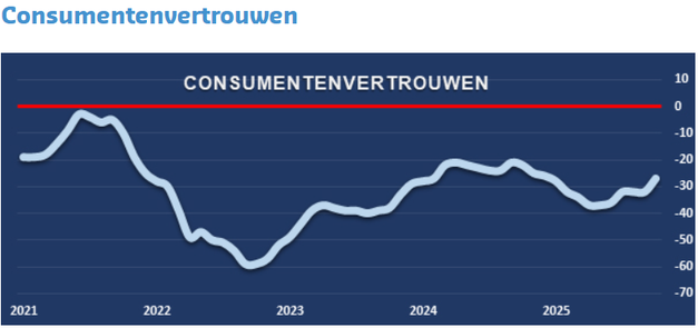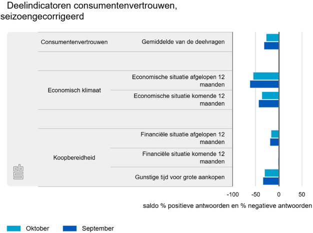 © MarktdataHet vertrouwen van consumenten is in oktober minder negatief dan in september, meldt het Centraal Bureau voor de Statistiek (CBS). Het consumentenvertrouwen stijgt van -32 in september naar -27 in oktober. Dat is de grootste verbetering in bijna 2 jaar. Consumenten zijn in oktober minder negatief over de economie dan in september.