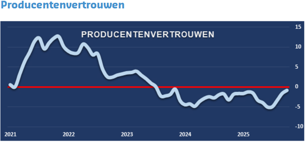 © MarktdataFabrikanten zijn in oktober opnieuw minder negatief dan een maand eerder. Het producentenvertrouwen gaat van –1,6 in september naar -0,8 in oktober, aldus het Centraal Bureau voor de Statistiek (CBS). Dat is de hoogste stand in 2,5 jaar. Producenten zijn in oktober opnieuw positiever over de verwachte bedrijvigheid in de komende drie maanden. Daarnaast zijn ze minder negatief over de voorraden gereed product en hun orderportefeuille.