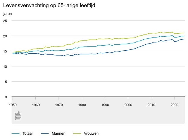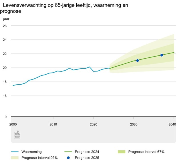 Volgens de nieuwste prognose van het Centraal Bureau voor de Statistiek (CBS) zal een 65-jarige in 2031 gemiddeld nog 21,02 jaar te leven hebben. Dat betekent dat de levensverwachting in Nederland blijft toenemen, al gaat die groei minder snel dan eerder werd verwacht.