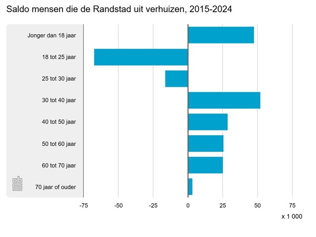 Tussen 2015 en 2024 verlieten vooral dertigers de Randstad: ruim 52 duizend meer mensen verhuisden naar een andere gemeente dan omgekeerd. Dit zijn vooral stellen, al dan niet met kinderen. Ook bijna 48 duizend kinderen verhuisden per saldo mee.