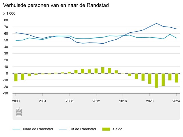 In 2024 verhuisden bijna 67 duizend mensen vanuit de Randstad naar een gemeente daarbuiten, 2 duizend minder dan een jaar eerder. Er vertrekken nog altijd meer mensen uit de Randstad dan ernaartoe verhuizen. Vooral dertigers trekken weg. Toch groeit de bevolking er iets sneller dan elders in Nederland. Dat komt door meer immigratie en geboorten, en minder overlijdens. Dat meldt het Centraal Bureau voor de Statistiek (CBS).