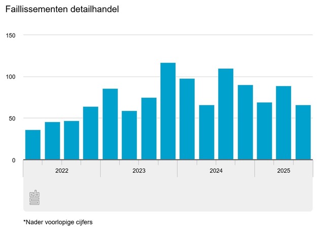 In het derde kwartaal zijn 66 detailhandelaren failliet verklaard, 40 procent minder dan in dezelfde periode het jaar ervoor, 7 procent van het totaal aantal faillissementen. In totaal zijn er 920 bedrijven failliet verklaard. Een jaar eerder waren er ruim 1 100 faillissementen, waarvan ongeveer 10 procent detailhandelaren.