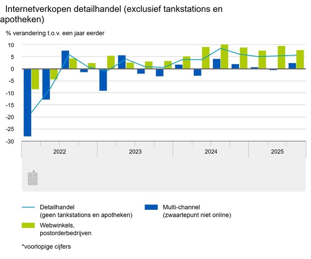 Detailhandelaren boeken meer online-omzet (5,6 procent) dan in dezelfde periode een jaar eerder. Bij winkels die alleen online verkopen is dat zelfs 7,8 procent. Detaillisten die hun producten zowel online als in een fysieke winkel verkopen (multichannelers), boeken 2,4 procent meer omzet.
