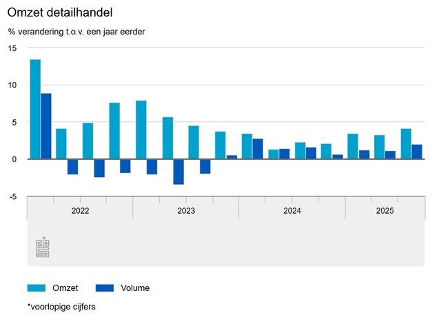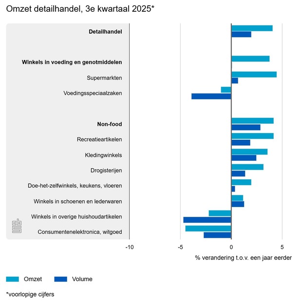 In het derde kwartaal van 2025 zette de detailhandel 4,1 procent meer om dan een jaar eerder. Het verkoopvolume is 2 procent groter. Doe-het-zelfzaken en keuken- en vloerenwinkels zagen hun omzet met 2,0% toenemen, terwijl hun verkoopvolume met 0,4% steeg.