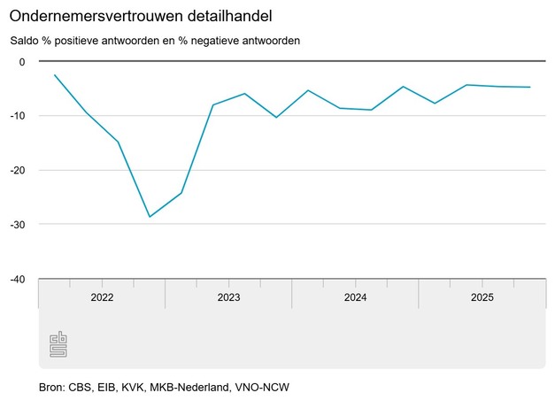 Het ondernemersvertrouwen van de detailhandel is -4,8 procent aan het begin van het vierde kwartaal, en is daarmee bijna gelijk aan het sentiment over het derde kwartaal. Ondernemers zijn negatiever over de ontwikkeling van het economisch klimaat (-7,1 procent) dan over de verwachting voor het economisch klimaat (-2,5 procent). Het ondernemersvertrouwen is negatief sinds het eerste kwartaal van 2022. In 2023 groeit het vertrouwen, maar ook in het laatste kwartaal van 2025 is dit nog niet positief.
