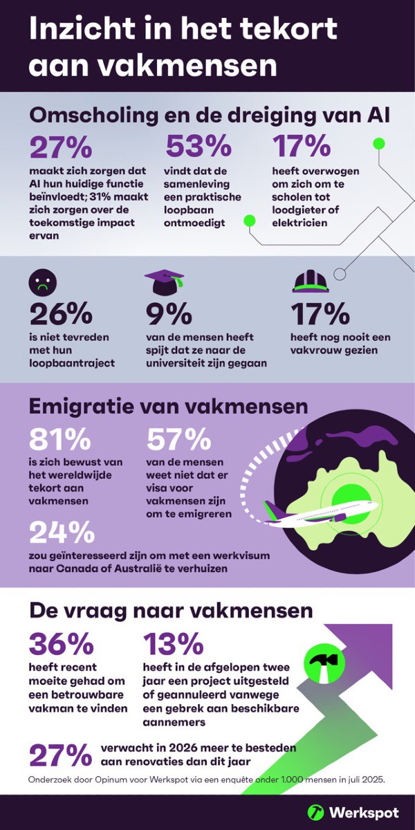Uit nieuw onderzoek van Werkspot.nl blijkt dat bijna een vijfde van de Nederlanders overweegt zich om te scholen tot vakman of vakvrouw. De belangstelling groeit, mede door zorgen over kunstmatige intelligentie en ontevredenheid over de huidige loopbaan: 22 procent van de respondenten geeft aan niet tevreden te zijn met hun huidige werk.