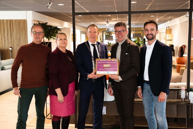 V.l.n.r. Fred Overdevest, Kantoorzaal, Michelle Stam-Laban, Stam Transport, Burgemeester Erik van Heijningen, Corné van Waaij, Van Waay Interieurs en Rob van der Meer, Aannemersbedrijf Van der Meer.