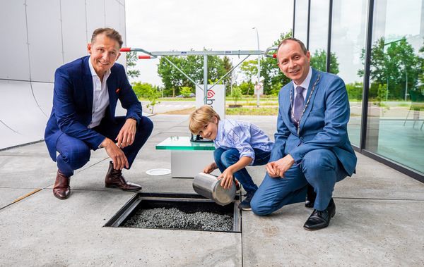 Tijn van Elderen, Matthijs van Dijk en burgemeester Anton Ederveen tijdens de opening van het nieuwe duurzame hoofdkantoor Brabantia in 2022.