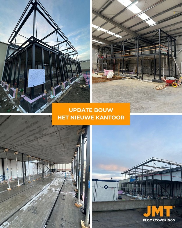 De bouw van het nieuwe kantoor van JMT Floorcoverings maakt duidelijke vorderingen. Het volledige staalframe, zowel aan de binnen- als buitenzijde, is inmiddels geplaatst. Daarmee worden de definitieve contouren van het gebouw zichtbaar en komt de realisatie van de nieuwe werkomgeving weer een stap dichterbij.