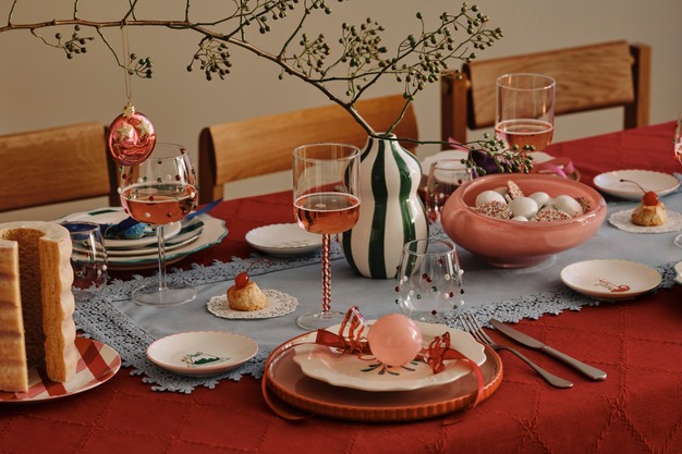 De feesttafel staat centraal, met producten zoals de Perli Glasses en Cutemas Candle Holders die zorgen voor een verfijnde, sfeervolle uitstraling.