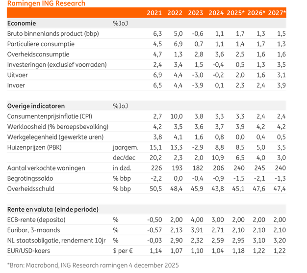 De Nederlandse economie groeit in 2026 naar verwachting van ING Research met 1,3%, een redelijk groeitempo. Structurele knelpunten zoals arbeidsmarktkrapte, netcongestie en stikstofbeperkingen blijven belangrijke belemmeringen, maar kunnen wel aangepakt worden door een nieuw kabinet. De groei zal in 2026 nog vooral van de consument komen.