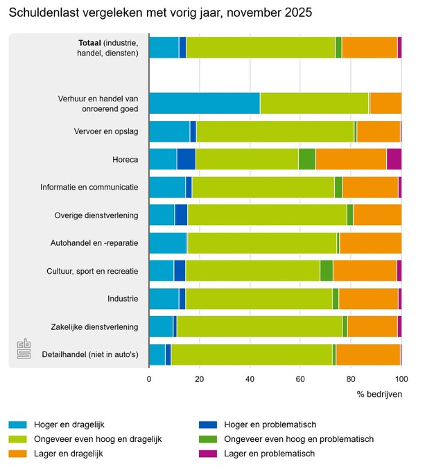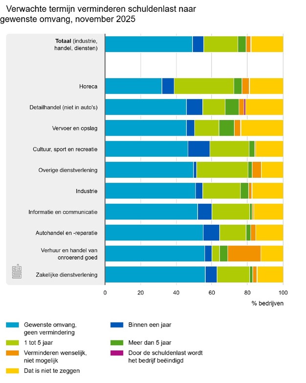 Bijna 7 procent van de bedrijven beoordeelt in november 2025 de eigen schulden als problematisch, nagenoeg evenveel als een jaar eerder. Volgens iets meer dan de helft is de schuldenlast niet van gewenste omvang. Bijna 4 procent denkt nog minder dan een jaar te bestaan in de huidige economische omstandigheden. Dit meldt het Centraal Bureau voor de Statistiek (CBS) op basis van de conjunctuurenquête onder bedrijven met vijf of meer werkzame personen.