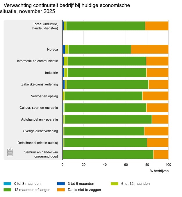 4 procent van de bedrijven verwacht minder dan een jaar te kunnen voortbestaan in de huidige economische situatie. Bijna drie kwart zegt de continuïteit langer dan een jaar te kunnen handhaven. Voor 22 procent is dat niet te zeggen. Horecabedrijven zeggen het vaakst (6 procent) dat ze het minder dan een jaar kunnen uithouden. Ook weten zij het vaakst niet (35 procent) hoelang ze het nog kunnen volhouden in de huidige omstandigheden.