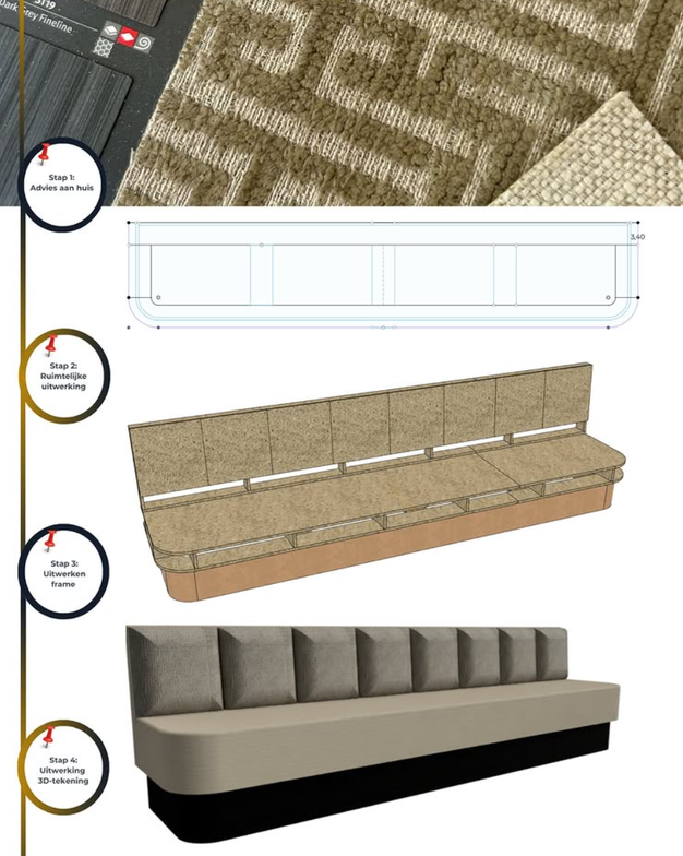 Het meubelframe wordt technisch uitgewerkt en vervaardigd in de houtzagerij, waarbij multiplex wordt gebruikt voor een robuuste en nauwkeurige constructie. Daarna volgt een controle van de 3D-tekening; na goedkeuring start de productie van het zitcomfort, met keuze uit verschillende koudschuimsoorten, en het stofferen van het meubel.