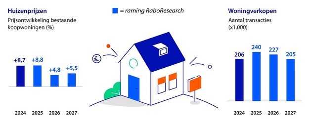 De verkoop van voormalige huurwoningen aan eigenaar-bewoners blijft onverminderd doorgaan. Volgens schattingen van het Kadaster zijn in de afgelopen vier kwartalen circa 34.000 ex-huurwoningen verkocht. Het toenemende aanbod drukt het tempo van de huizenprijsstijging; na een gemiddelde groei van 8,8% in 2025 wordt voor 2026 een stijging van 4,8% verwacht. In 2027 trekt de prijsontwikkeling weer iets aan tot gemiddeld 5,5%.