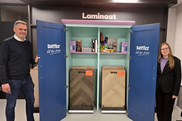 Joost Heijnen en Rozemarijn Zuurveld bij de presentatiekast van INTR.'s eigen vloerenmerk Saffier.