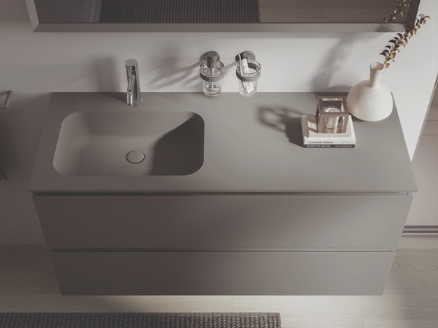 Natuurlijke materialen blijven prominent aanwezig. Travertin, terrazzo en kalksteen, in zowel echte vorm als duurzame lookalikes, brengen een aardse, rustgevende basis. Het Sanijura Infinie-meubel, met een dik HPL-blad en keuze uit diverse uni-kleuren, houtstructuren en stone effects, sluit hierop aan. Ook de 9 mm terrazzo-wandpanelen van Dzignstone dragen bij aan een uniforme, serene uitstraling.