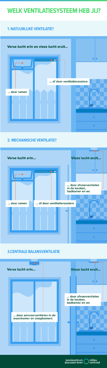 Veel mensen verwarren ventileren met 'even luchten'. Ventileren betekent dat er voortdurend schone lucht binnenkomt en vervuilde lucht wordt afgevoerd. Bij luchten worden ramen en deuren kort tegenover elkaar opengezet. Milieu Centraal ziet dat Nederlanders ventilatie belangrijk vinden, maar vaak niet weten hoe ze dit goed moeten aanpakken. Pas wanneer de gezondheid of woningkwaliteit verslechtert, komen mensen in actie.