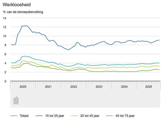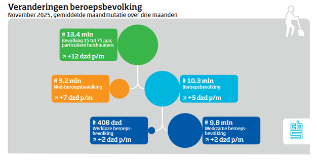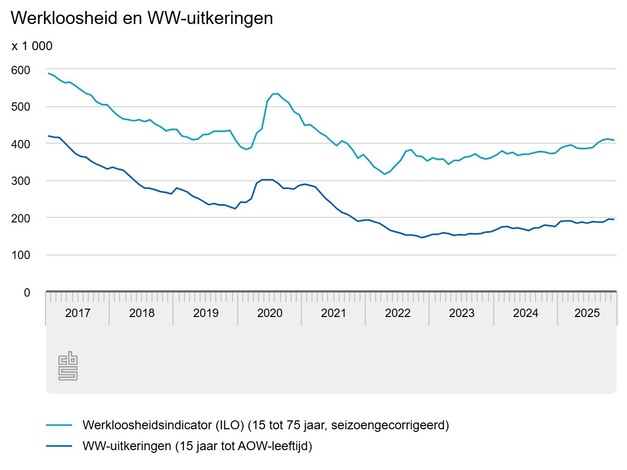In november 2025 waren er 408 duizend werklozen. Net als in september en oktober was 4,0 procent van de beroepsbevolking van 15 tot 75 jaar werkloos. Het aantal werklozen en het aantal mensen met werk steeg in de afgelopen drie maanden met gemiddeld 2 duizend per maand. De werkloosheid stijgt hoofdzakelijk bij jongeren. Dit meldt het Centraal Bureau voor de Statistiek (CBS) op basis van nieuwe cijfers. UWV registreerde eind november 194 duizend lopende WW-uitkeringen.