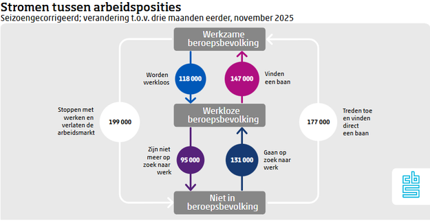 Er zijn ook twee stromen waardoor de werkloosheid stijgt. Het gaat om werkenden die hun baan verliezen (118 duizend), en om mensen die zich eerder niet aanboden op de arbeidsmarkt, maar nu op zoek zijn naar werk (131 duizend). Als ze niet meteen werk vinden, worden ze deel van de werkloze beroepsbevolking. Het totaal aantal mensen dat hierdoor werkloos werd, bedroeg in november 249 duizend.